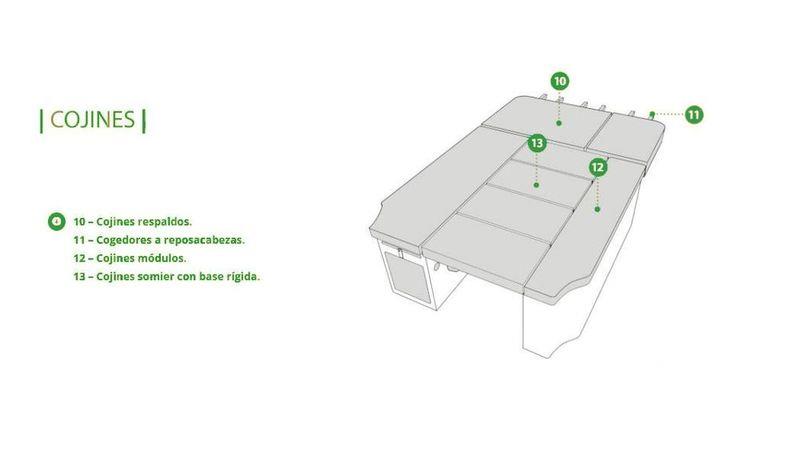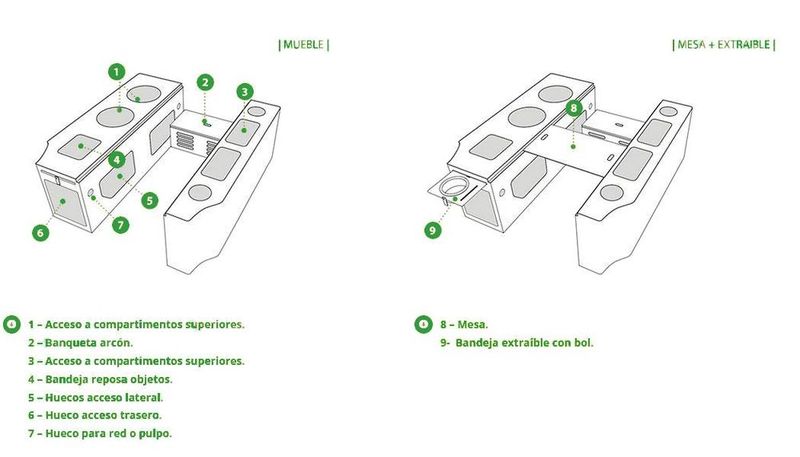 É composto por dois baús laterais e um baú de armazenamento central. O pack inclui sete compartimentos de arrumação , adaptados de acordo com o modelo. Os espaços superiores são projetados para armazenar objetos pequenos e os compartimentos inferiores para itens maiores. Guarde o tanque do chuveiro, alguns esquis, pertences, lençóis, roupas, etc. O kit de camperização incorpora uma bandeja removível que inclui um recipiente para cozinhar, cortar, descascar e outras atividades necessárias durante as suas viagens.