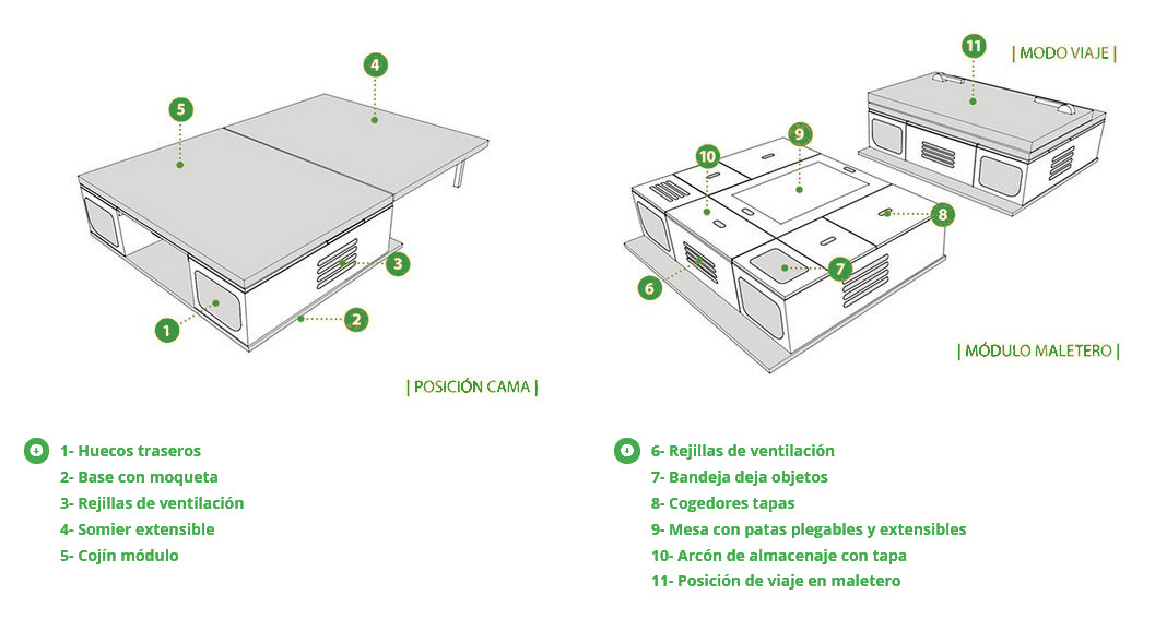 É composto por dois baús laterais de arrumação e um banco central com pernas extensíveis. O pack inclui compartimentos de arrumação, adaptados de acordo com o modelo. Os espaços superiores são projetados para armazenar objetos pequenos e os compartimentos inferiores para itens maiores. Guarde o tanque do chuveiro, alguns esquis, pertences, lençóis, roupas, etc.
