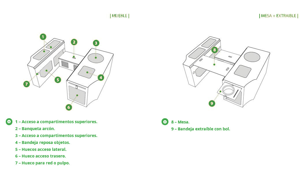 É composto por dois caixas laterais e um caixa de armazenamento central. O pack inclui sete compartimentos de arrumação , adaptados de acordo com o modelo. Os espaços superiores são projetados para armazenar objetos pequenos e os compartimentos inferiores para itens maiores. Guarde o tanque do chuveiro, alguns esquis, pertences, lençóis, roupas, etc. O kit de camperização incorpora uma bandeja removível que inclui um recipiente para cozinhar, cortar, descascar e outras atividades necessárias durante as suas viagens.