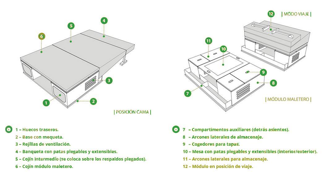 É composto por dois baús laterais de arrumação e um banco central com pernas extensíveis. O pack inclui compartimentos de arrumação, adaptados de acordo com o modelo. Os espaços superiores são projetados para armazenar objetos pequenos e os compartimentos inferiores para itens maiores. Guarde o tanque do chuveiro, alguns esquis, pertences, lençóis, roupas, etc.