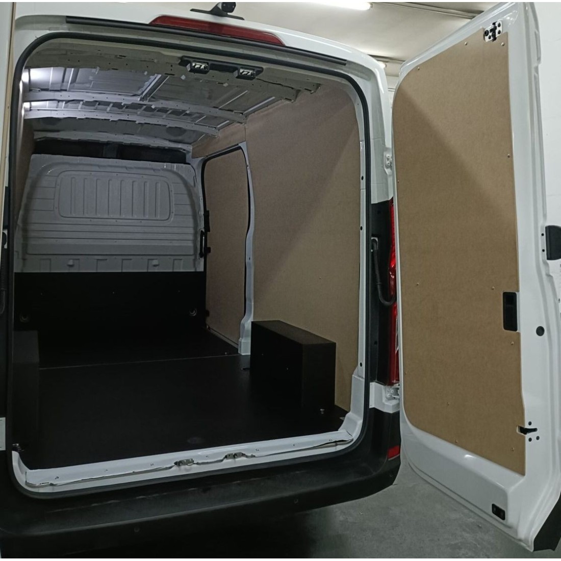 Painéis de carrinha em madeira DM especificamente concebidos para Citroën Jumpy (desde 2016) L1H1, Peugeot Expert (desde 2016) L1H1, Toyota ProAce (desde 2016) L1H1, Opel Vivaro (desde 2019) L1H1 Carrinha, com porta lateral deslizante, portas traseiras, tejadilho standard e divisória em chapa metálica.