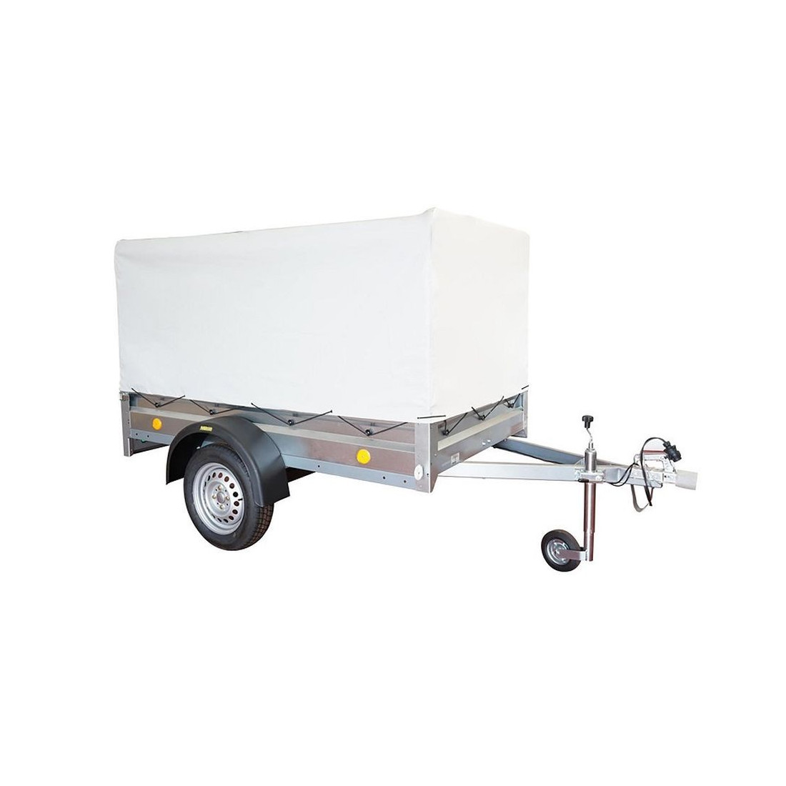 Anéis laterais que facilitam a fixação da carga e do toldo. Roda de jóquei incluída.