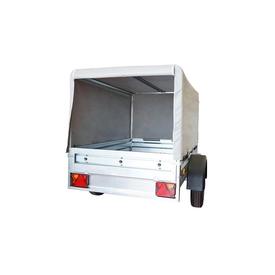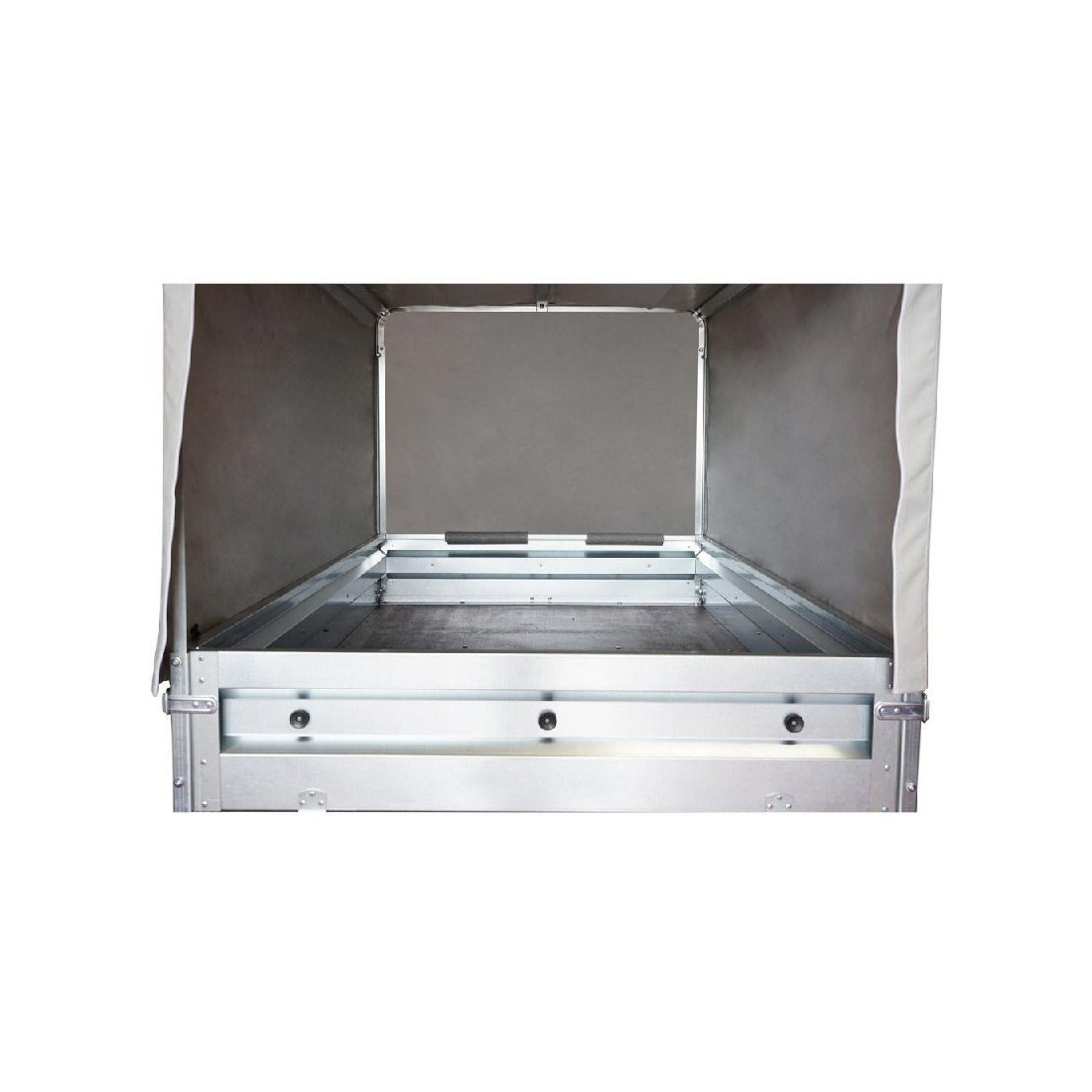 O toldo é instalado sobre uma estrutura metálica que o eleva a uma altura de 80 cm acima do reboque (altura total 107 cm).