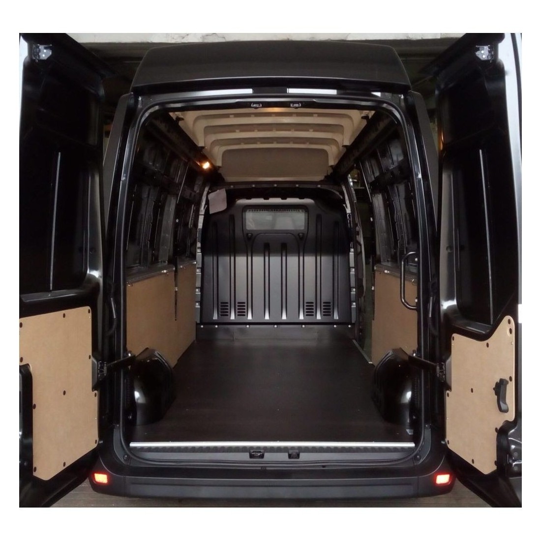 Pavimento em contraplacado castanho especificamente desenhado para Renault Trafic (2001-2014) L1H1, Opel Vivaro (2001-2014) L1H1, Nissan Primastar (2002-2016) L1H1 Combi 6 bancos com porta lateral deslizante e duas portas traseiras.