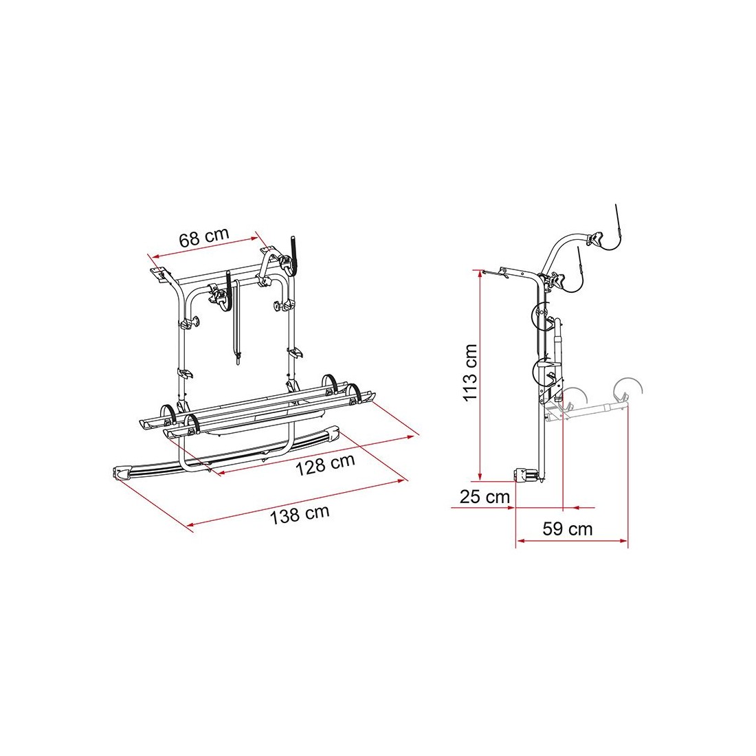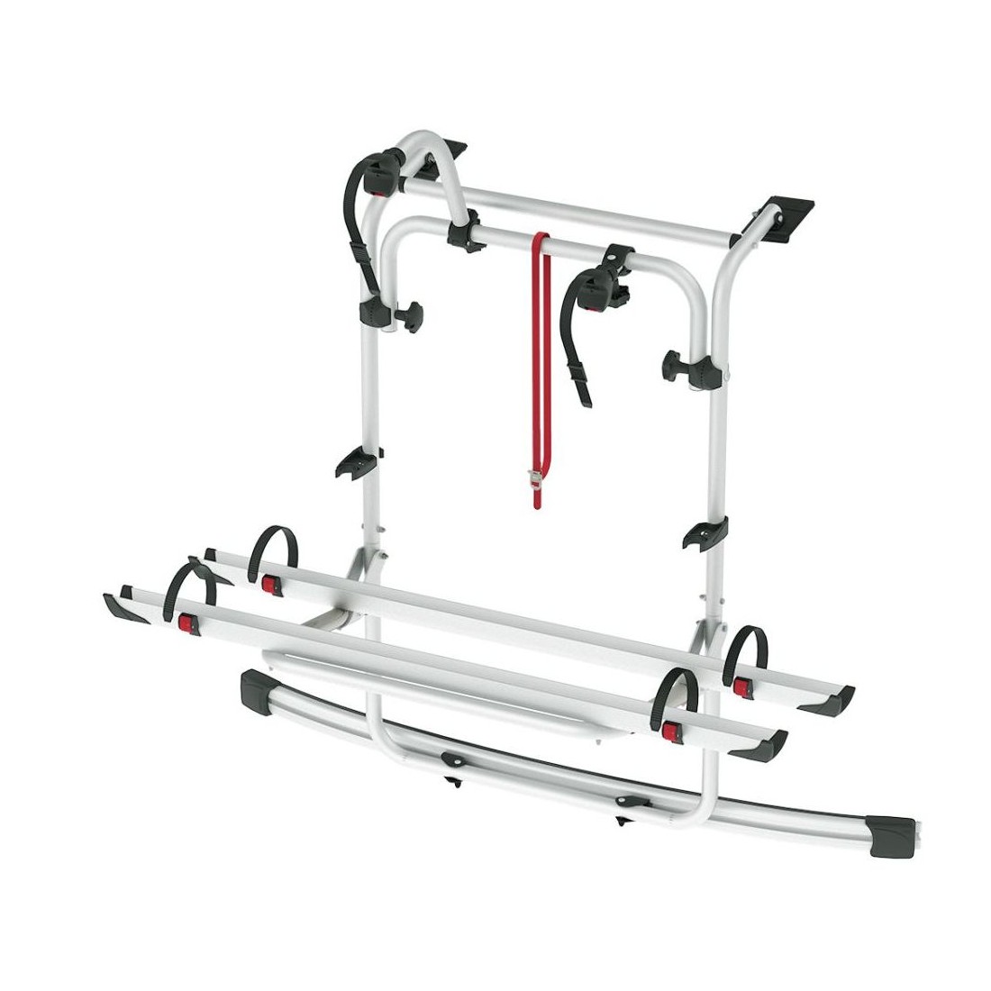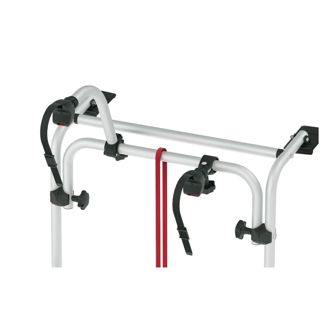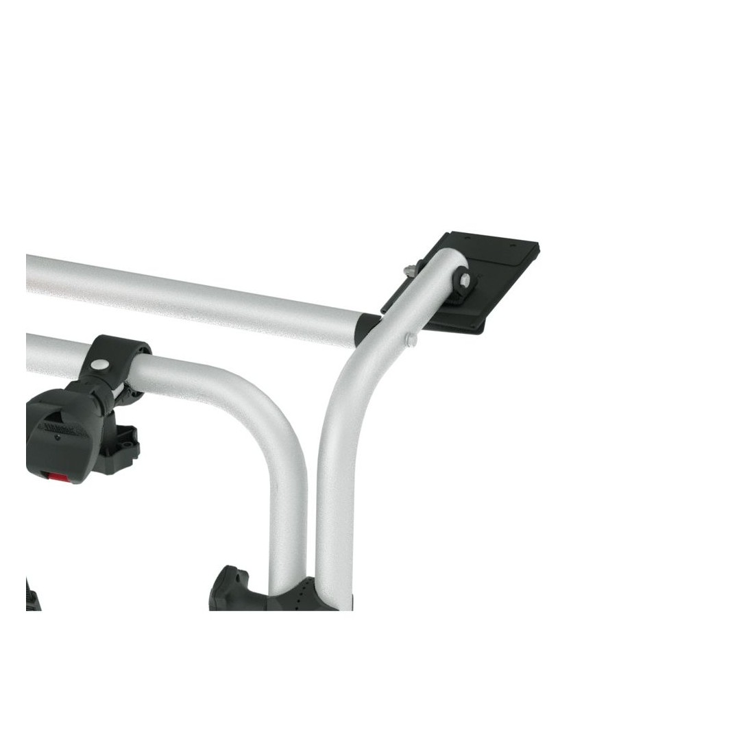 A instalação é feita fixando-a à extremidade da tampa da bagageira utilizando tensores integrados no suporte para bicicletas. Garante estabilidade e facilidade de montagem.