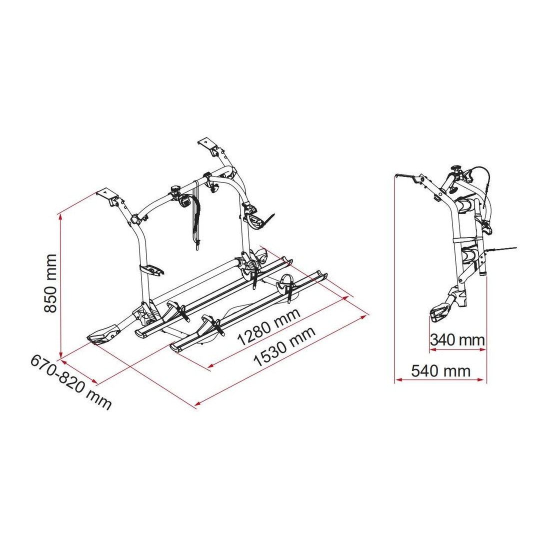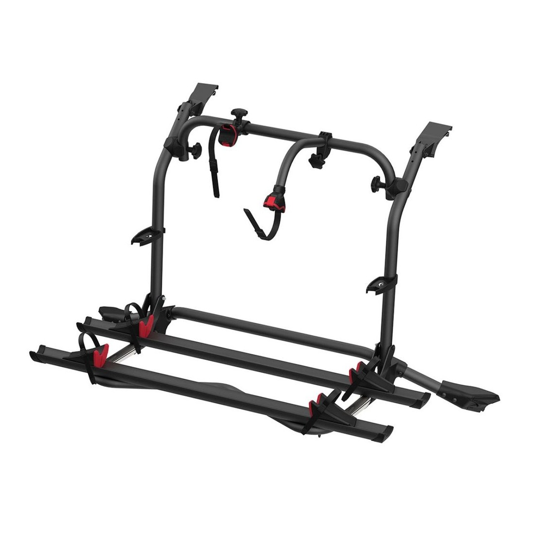 Porta-bicicletas específico para Volkswagen T5 resistente e seguro. Permite o transporte de 2 bicicletas na zona traseira (expansível até 4) e é compatível com bicicletas elétricas.