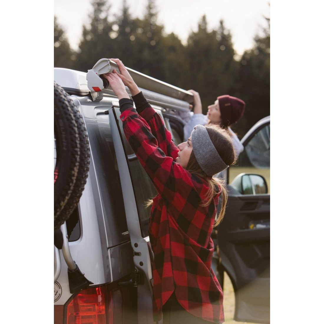 Com 1,80 m de comprimento, o toldo é facilmente instalado na zona alta do tejadilho da carrinha, quer na parede, utilizando os suportes específicos quer no carril.